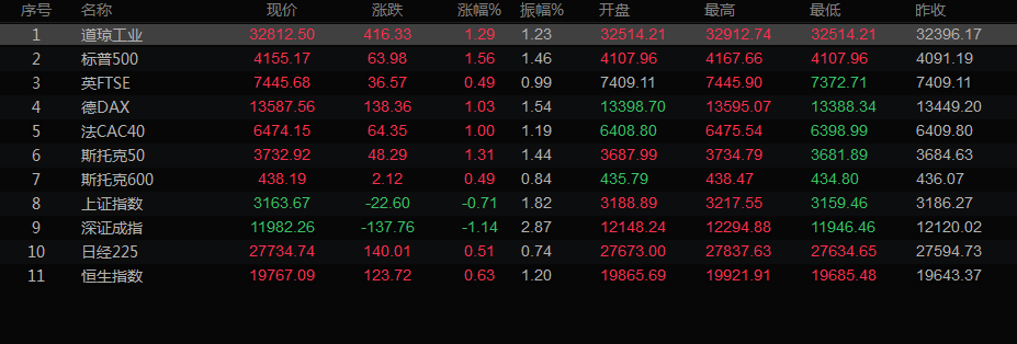 美股收盘情况,道琼斯工业指数上涨1.29%,至32812.50点;标普500指数攀升1.56%,至4155.12点;纳斯达克指数跳涨2.59%,至12668.16点。
