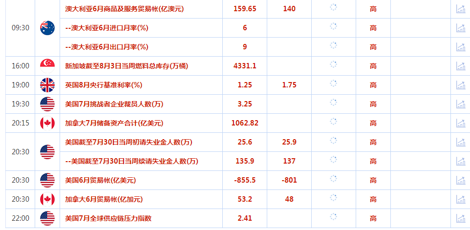 16:00欧洲央行公布经济公报;19:00 英国央行公布利率决议和会议纪要;19:30英国央行行长贝利召开货币政策新闻发布会