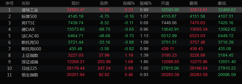 美股收盘情况,标普500指数下跌0.16%,收于4145.19点。纳斯达克指数下跌0.50%,至12657.56点。道琼斯工业指数上涨0.23%,至32803.47点。