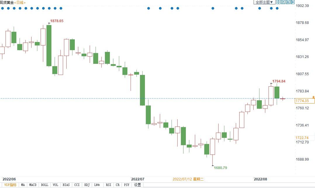 北京时间8月8日14:39,现货黄金报1774.27美元/盎司。