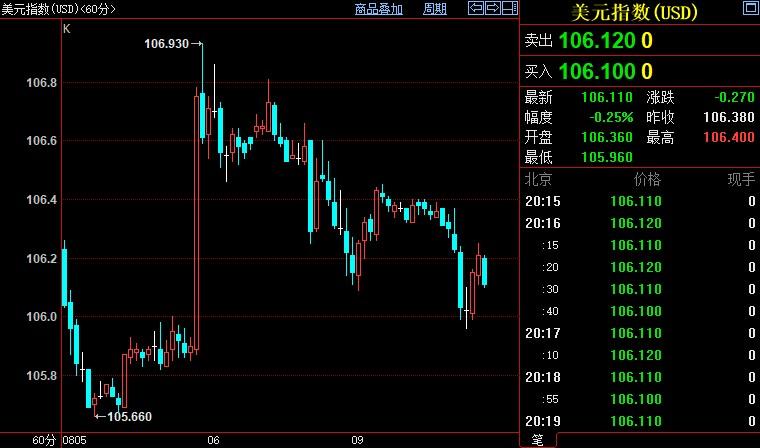 北京时间20:19,现货黄金下跌0.02%至1783.39美元/盎司;COMEX期金主力合约下跌0.03%至1804.9美元/盎司;美元指数下跌0.25%至106.117。