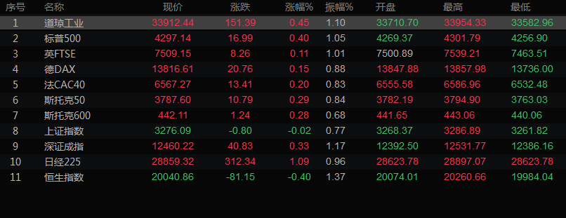 美股收盘情况,道琼斯工业指数上涨0.45%,至33912.44点;标普500指数上涨0.40%,至4297.14点;纳斯达克指数上涨0.62%,至13128.05。