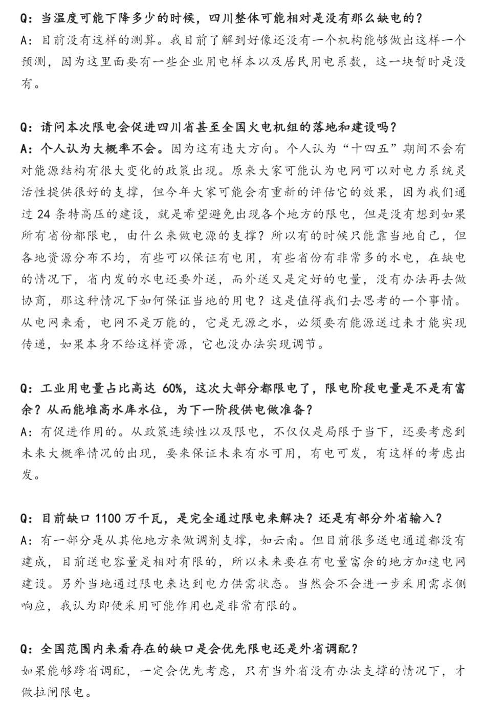 前段时间全国要求严禁电网自然治理。对于居民用户不限电,工商业的用电可能受到一定的限制,高温天气是非常重要的诱因,今年四川的水面不是很乐观,因为今年的降水较往年降低了 4 成。同时外省的煤电仍然是偏紧的。另外很重要的一点是四川省能源结构,四川省整个来讲,水力发电占了大头,水电装机占到 78%,提供了超过 80%的发电量,火电仅仅占到了 16%的装机容量。所以即便是煤炭供应起来,水电如果跟不上的话,起到的效果是有限的。另外一块,四川省水电的外送连续几年都保持在高位,并且我国家规划的外送路线很多。第五条的出川特高压线路也建成了,现在每一年实际的外送电量都超过了 1,300 亿 kWh。四川省每一年发电量 4300 亿 kWh,有接近三分之一要送出去,而且是优先要送出去,不是说本省没有电用了,就先供给自己,这是省政府与省政府之间达成的调度,从某种意义上来讲也缓解了华东地区限电情况进一步加剧,今年目前最大的用电负荷是超过了 6000 万 kW,是非常非常大的,本身用电缺口据说是有 1000 万 kW,所以四川省限电措施是比较严厉的,这个是目前的一个情况。