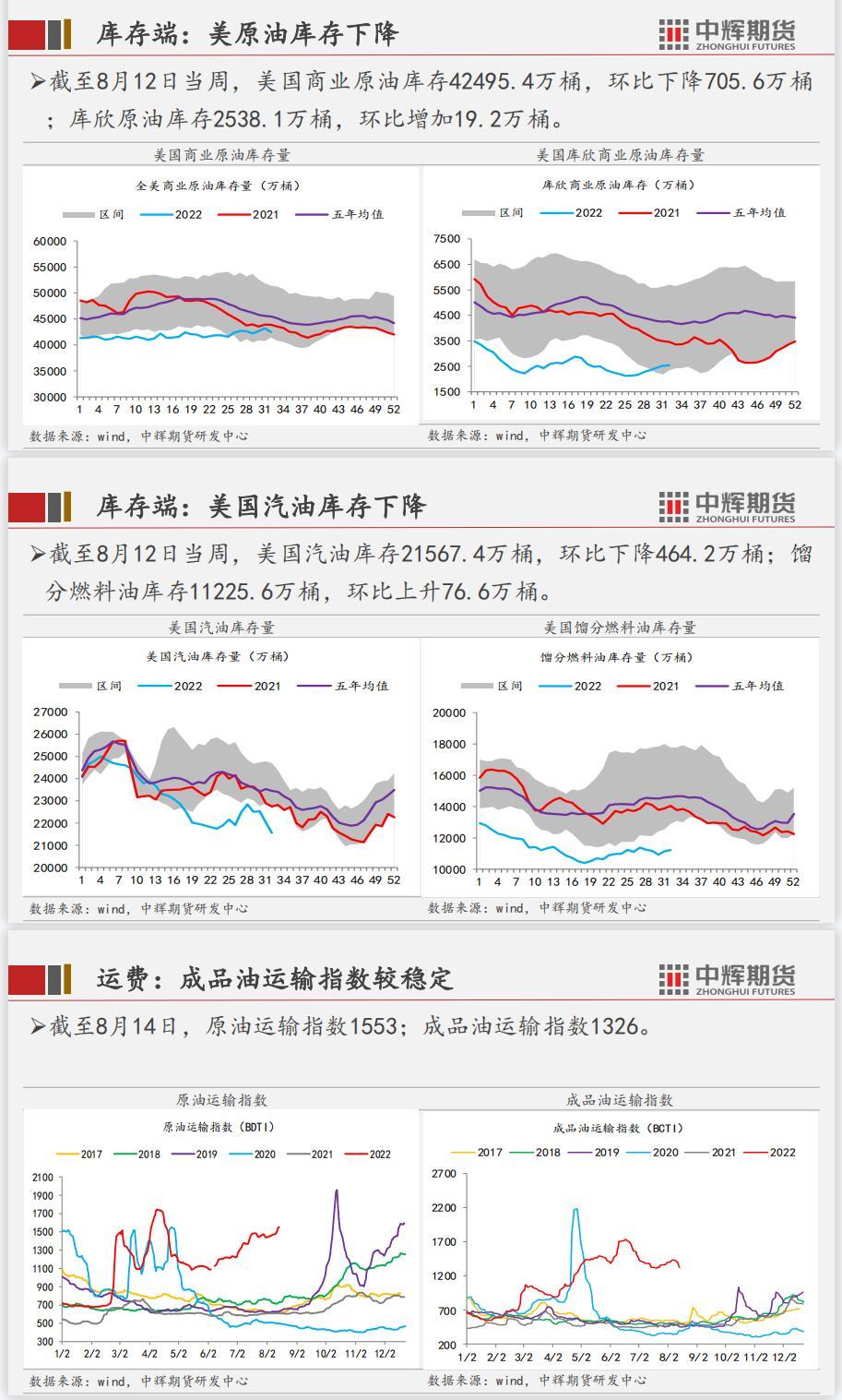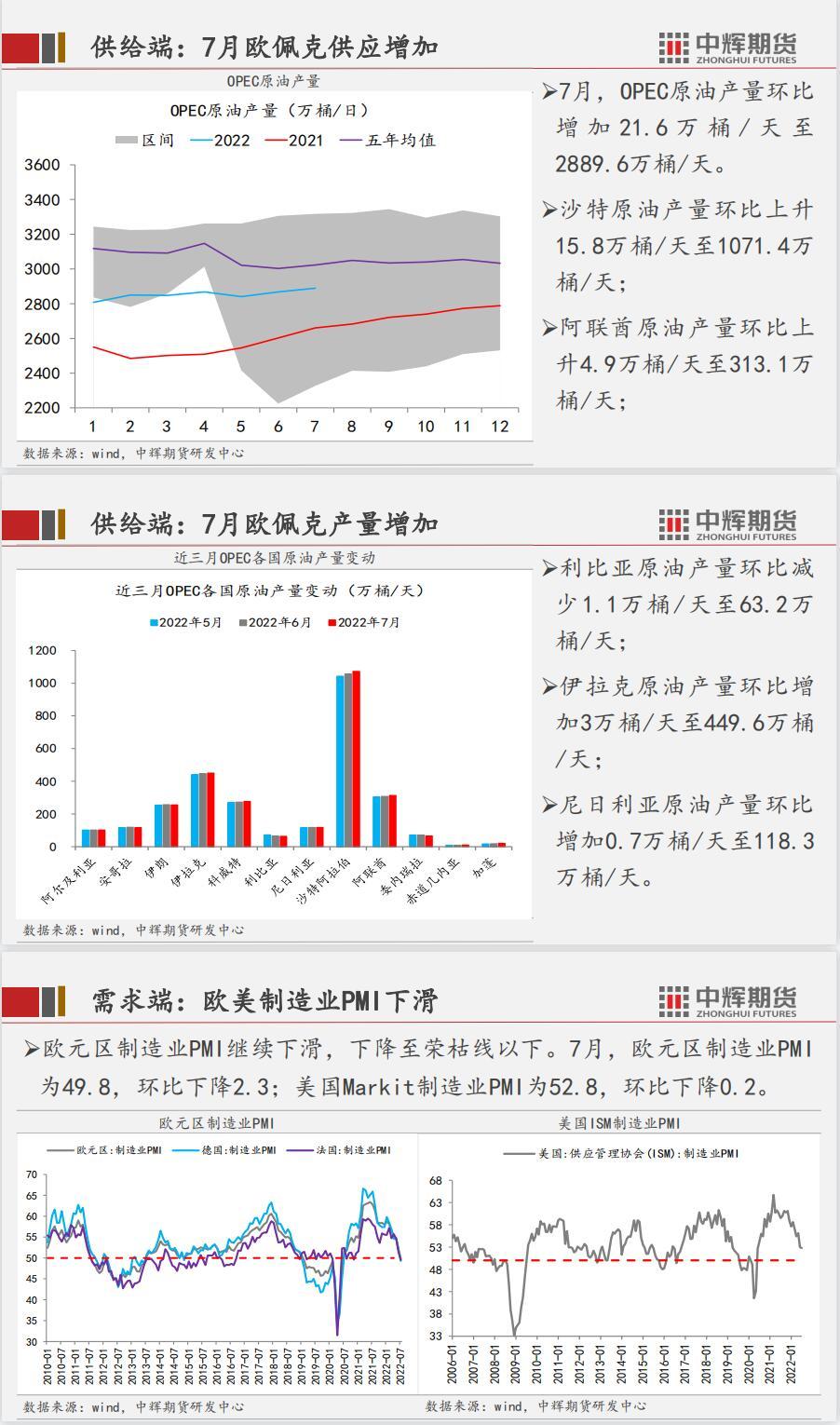 供应端,美国原油产量基本持平,7月OPEC方面产量继续增加。需求端,宏观方面,中、美、欧等主要经济体的数据并不乐观,预示经济下行压力;微观方面,美炼厂开工率小幅下降,国内炼厂产能利用率提升明显。库存端,美国商业原油、战略储备、汽油等库存全线下降,且绝对值处于低位,反映出原油的需求仍然强劲。总体而言,全球经济预期不佳,但短期来看需求仍有韧性,加之美联储释放少数鸽派态度,原油强现实弱预期的态势仍然延续,近期预计震荡为主。