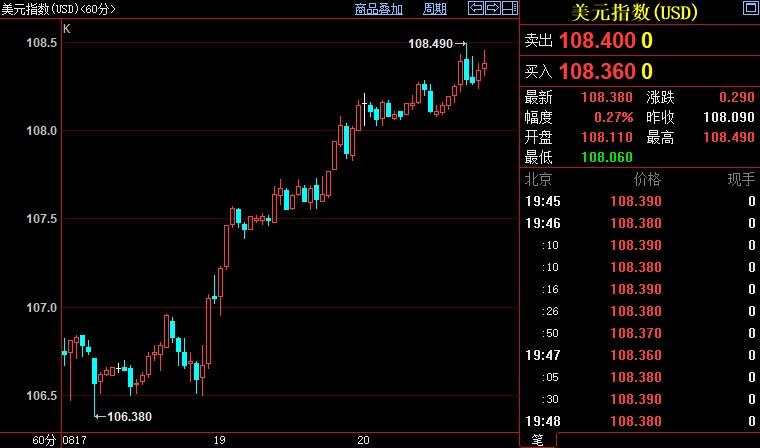 北京时间19:47,现货黄金下跌0.87%至1732.38美元/盎司;COMEX期金主力合约下跌1.01%至1745.1美元/盎司;美元指数上浮0.27%至108.391,创7月15日以来新高108.497。