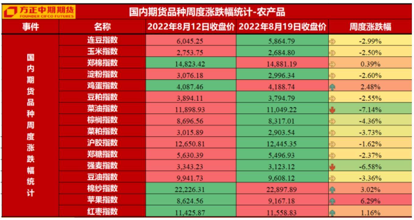 生鲜软商品板块:本周生鲜果品走势有所分化,苹果表现强势,红枣继续震荡。苹果基本面情况来看,消费微幅好转与早熟苹果价格高位运行提振市场信心,期价呈现小幅走高态势;红枣市场来看,仓单压力与成本支撑博弈继续,期价窄幅震荡。后期来看,苹果持续支撑因子有待进一步验证,暂时维持上行空间有限的判断,红枣基本面因素仍不明朗,期价或继续区间震荡波动。本周软商品都呈现弱势波动。纸浆市场来看,需求弱势施压下,期价高位回落;橡胶市场来看,主产国供应回升施加压力,消费端表现不及预期,市场继续承压;白糖市场来看,消费端疲弱叠加外盘弱势施压,期价继续回落;棉花市场来看,美棉优良率偏低提振外盘拉涨,给国内带来一定信心,但是国内消费跟涨表现不足,期价冲高回落。后期来看,软商品板块承压因素延续,整体或继续区间内弱势波动。