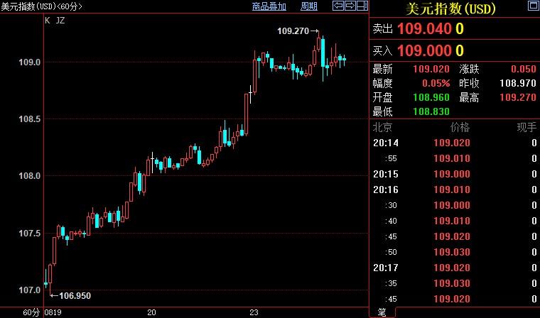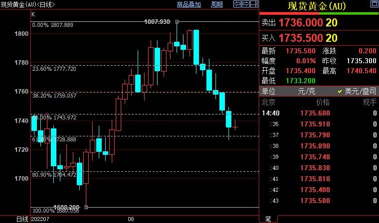 北京时间20:17,现货黄金下跌0.05%至1735.31美元/盎司;COMEX期金主力合约下跌0.03%至1747.9美元/盎司;美元指数上浮0.06%至109.026。