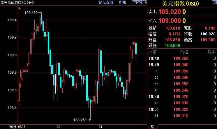 北京时间19:51,现货黄金下跌0.52%至1714.98美元/盎司;COMEX期金主力合约下跌0.56%至1726.6美元/盎司;美元指数上浮0.18%至109.025。