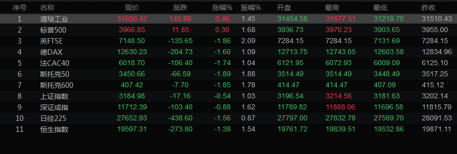 美股收盘情况:道琼斯工业指数上涨0.46%,至31656.42点;标普500指数上涨0.30%,至3966.85点;纳斯达克指数下跌0.26%,至11785.13。