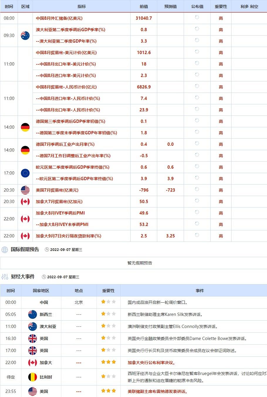 ③9月7日(周三)关键字:欧元区第二季度季调后GDP季率终值,加拿大央行利率决议