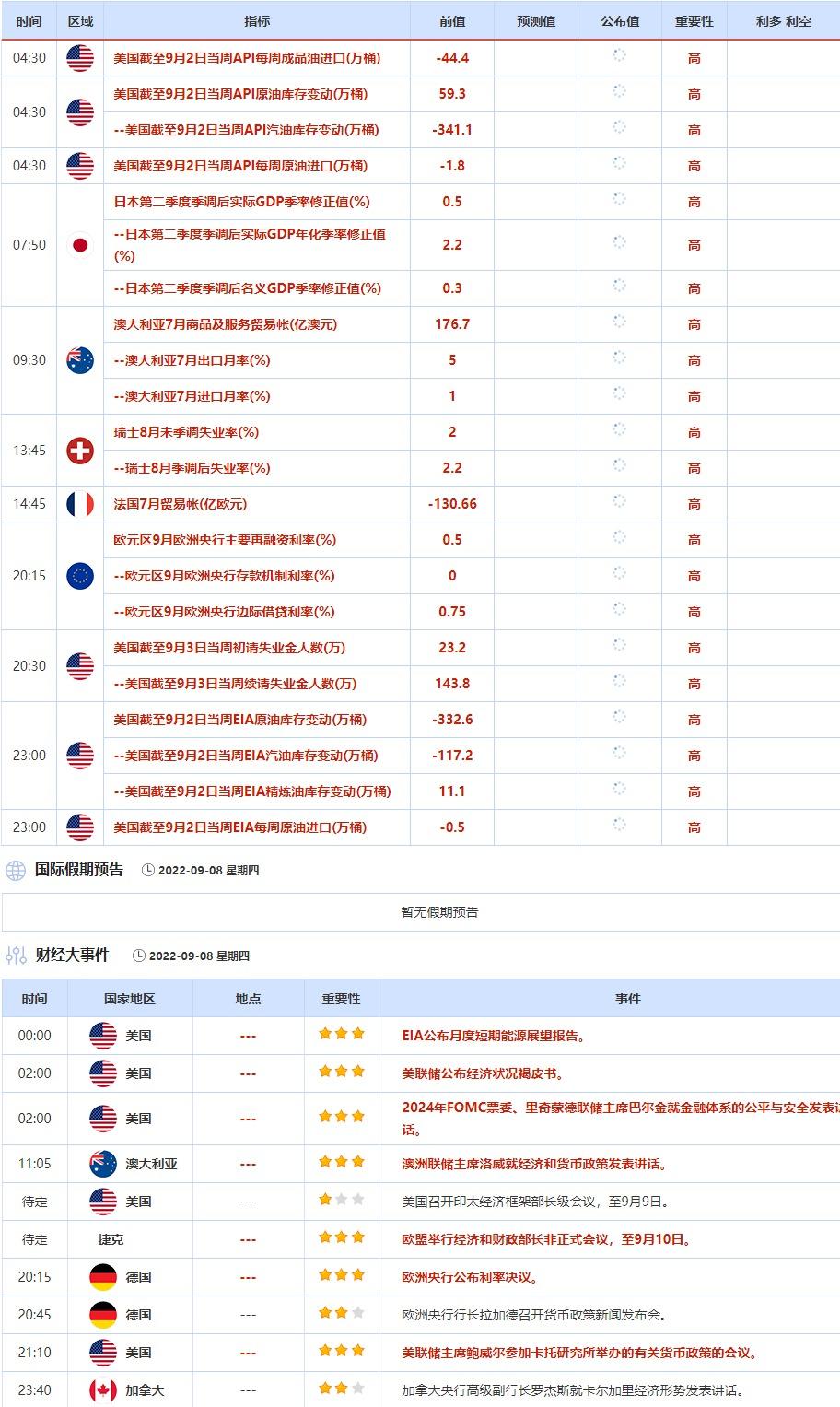 ④9月8日(周四)关键字:美国截至9月2日当周API和EIA原油库存变动, 美国截至9月3日当周初请失业金人数,欧洲央行利率决议
