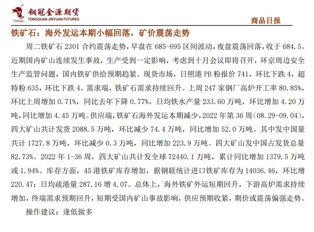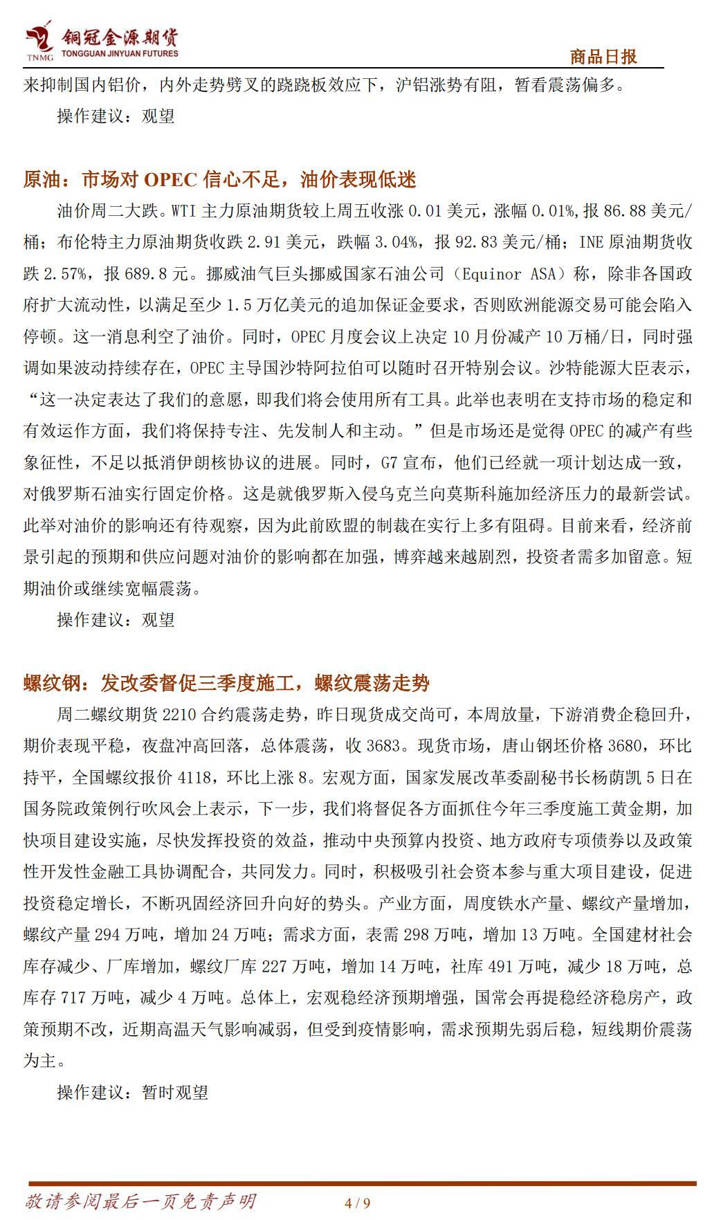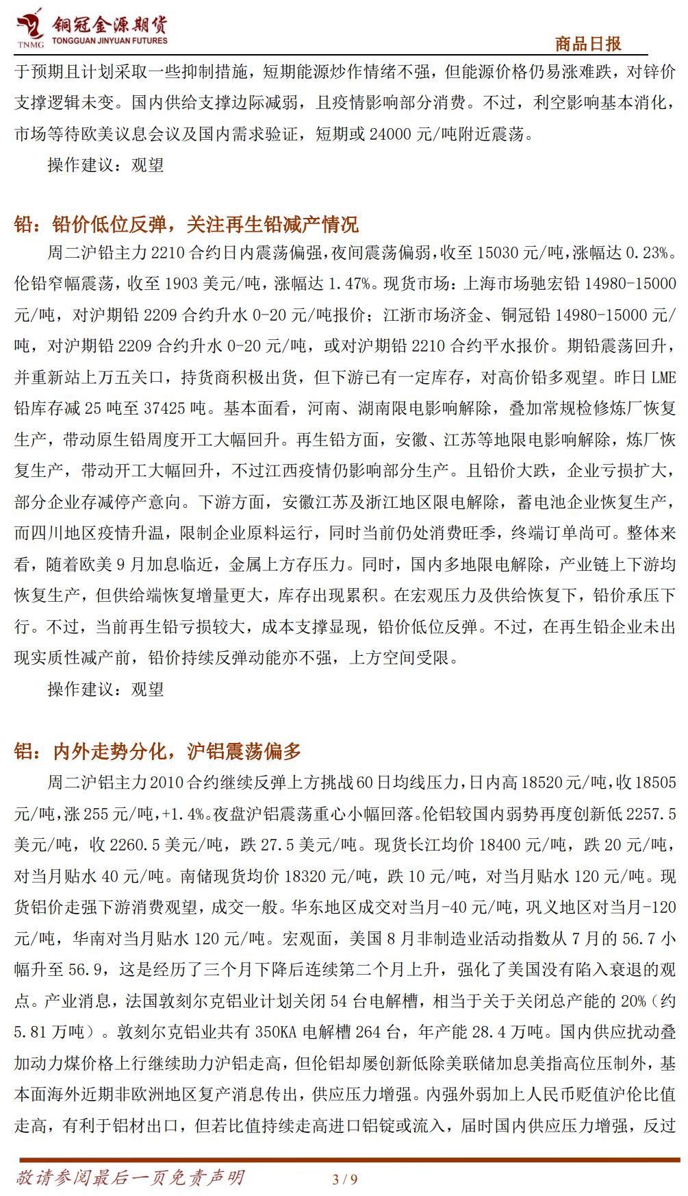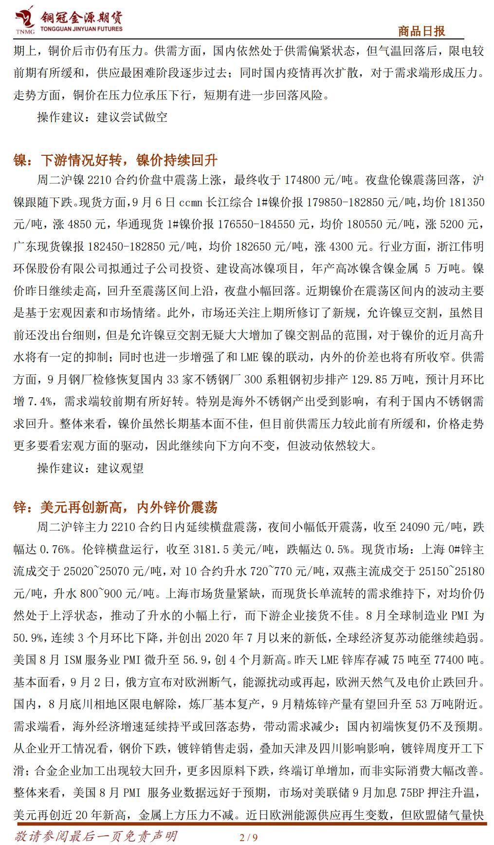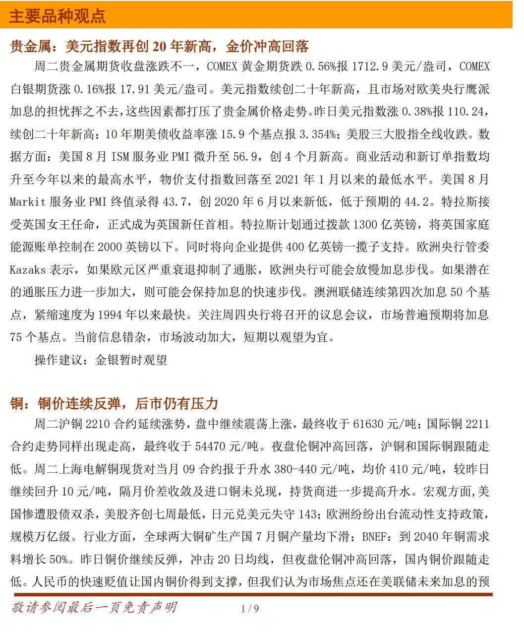 周二贵金属期货收盘涨跌不一,COMEX 黄金期货跌 0.56%报 1712.9 美元/盎司,COMEX白银期货涨 0.16%报 17.91 美元/盎司。美元指数续创二十年新高,且市场对欧美央行鹰派加息的担忧挥之不去,这些因素都打压了贵金属价格走势。昨日美元指数涨 0.38%报 110.24,续创二十年新高;10 年期美债收益率涨 15.9 个基点报 3.354%;美股三大股指全线收跌。数据方面:美国 8 月 ISM 服务业 PMI 微升至 56.9,创 4 个月新高。商业活动和新订单指数均升至今年以来的最高水平,物价支付指数回落至 2021 年 1 月以来的最低水平。美国 8 月Markit 服务业 PMI 终值录得 43.7,创 2020 年 6 月以来新低,低于预期的 44.2。特拉斯接受英国女王任命,正式成为英国新任首相。特拉斯计划通过拨款 1300 亿英镑,将英国家庭能源账单控制在 2000 英镑以下。同时将向企业提供 400 亿英镑一揽子支持。欧洲央行管委Kazaks 表示,如果欧元区严重衰退抑制了通胀,欧洲央行可能会放慢加息步伐。如果潜在的通胀压力进一步加大,则可能会保持加息的快速步伐。澳洲联储连续第四次加息 50 个基点,紧缩速度为 1994 年以来最快。关注周四央行将召开的议息会议,市场普遍预期将加息75 个基点。当前信息错杂,市场波动加大,短期以观望为宜。