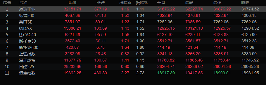 美股收盘情况:道琼斯工业指数上涨1.19%,至32151.71;标普500指数上涨1.53%,至4067.36;纳斯达克指数上涨2.11%,至12112.31。