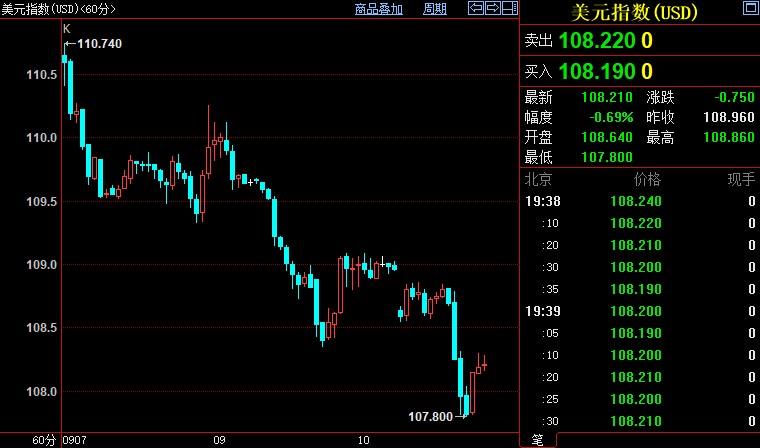 北京时间19:38,现货黄金上涨0.74%至1728.62美元/盎司;COMEX期金主力合约上涨0.66%至1740.1美元/盎司;美元指数下跌0.71%至108.209。