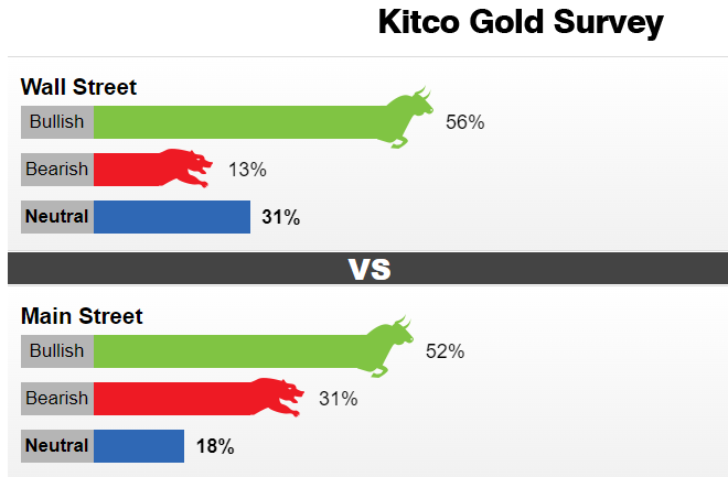 上周,共有16名市场专业人士参加了Kitco News对华尔街的调查。其中9名分析师(56%)看好本周黄金的表现,2名分析师(13%)看空黄金,5名分析师(31%)对黄金持中性看法。