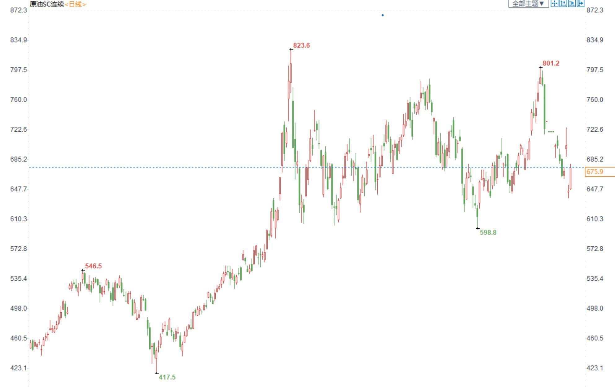 期货市场,布油目前在94美元附近震荡整理,小幅收跌;国内SC2211合约收盘价675.9,大幅收涨。