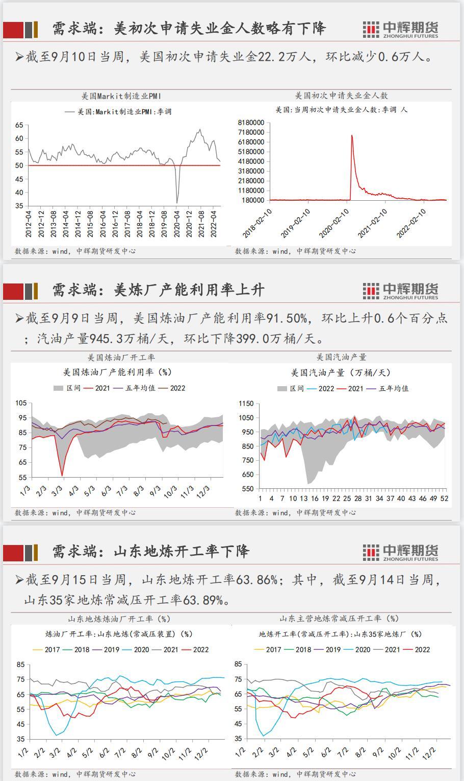 供应端,美国原油产量保持平稳,8月OPEC方面产量增加,产能达到 2965.1万桶/天。需求端,美炼厂开工率略有上升,国内炼厂产能利用率 上升2.41个百分点。库存端,美原油总库存下降,虽然美商业原油库存 较上周增长244.2万桶,但战略原油大幅下降841.4万桶。总体而言,全 球经济预期不佳,油价长期来看相对弱势,但美国和OPEC都有较强的挺 价意愿,叠加国际地缘政治因素,预计后期原油价格会继续震荡,长期偏弱。