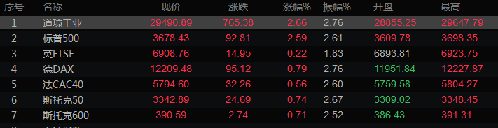 美股收盘情况: 道琼斯工业指数上涨2.66%,至29490.89点;标普500指数上涨2.59%,至3678.43点;纳斯达克指数上涨2.27%,至10815.44点。