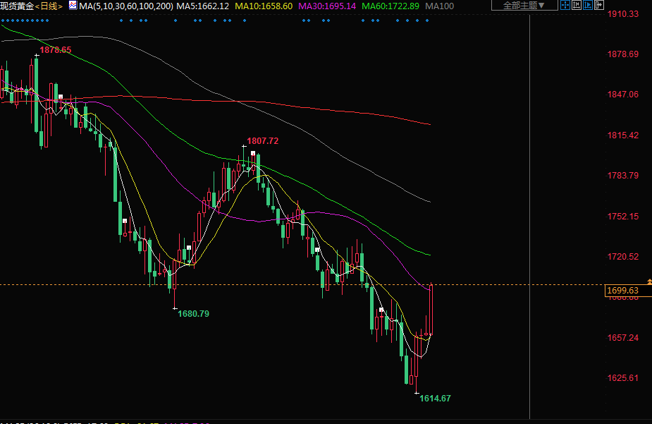 美国指标10年期国债收益率降至超过一周的低点,支持对非孽息黄金的需求。 美元回软为黄金提供了一些喘息的机会,黄金价格自上周滑落至2020年4月以来的最低点后走出了小反弹行情。钯金跳涨3.6%至2,236.14美元。铂金升4.7%至每盎司899.46美元。