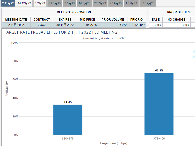 黄金价格走势前景取决于即将发布的美国就业数据,有望让美联储11月加息幅度前景变得更加清晰。根据芝商所的“联储观察”工具,市场预计美联储下个月连续第四次升息75个基点的可能性超过65%。
