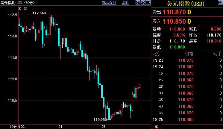 北京时间19:24,现货黄金下跌0.94%至1709.81美元/盎司;COMEX期金主力合约下跌0.70%至1718.4美元/盎司;美元指数上涨0.63%至110.873。