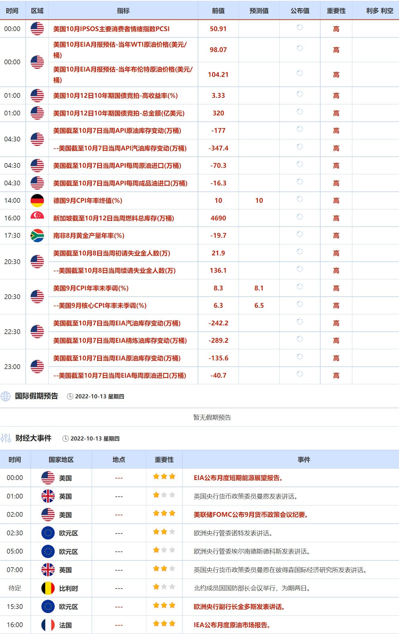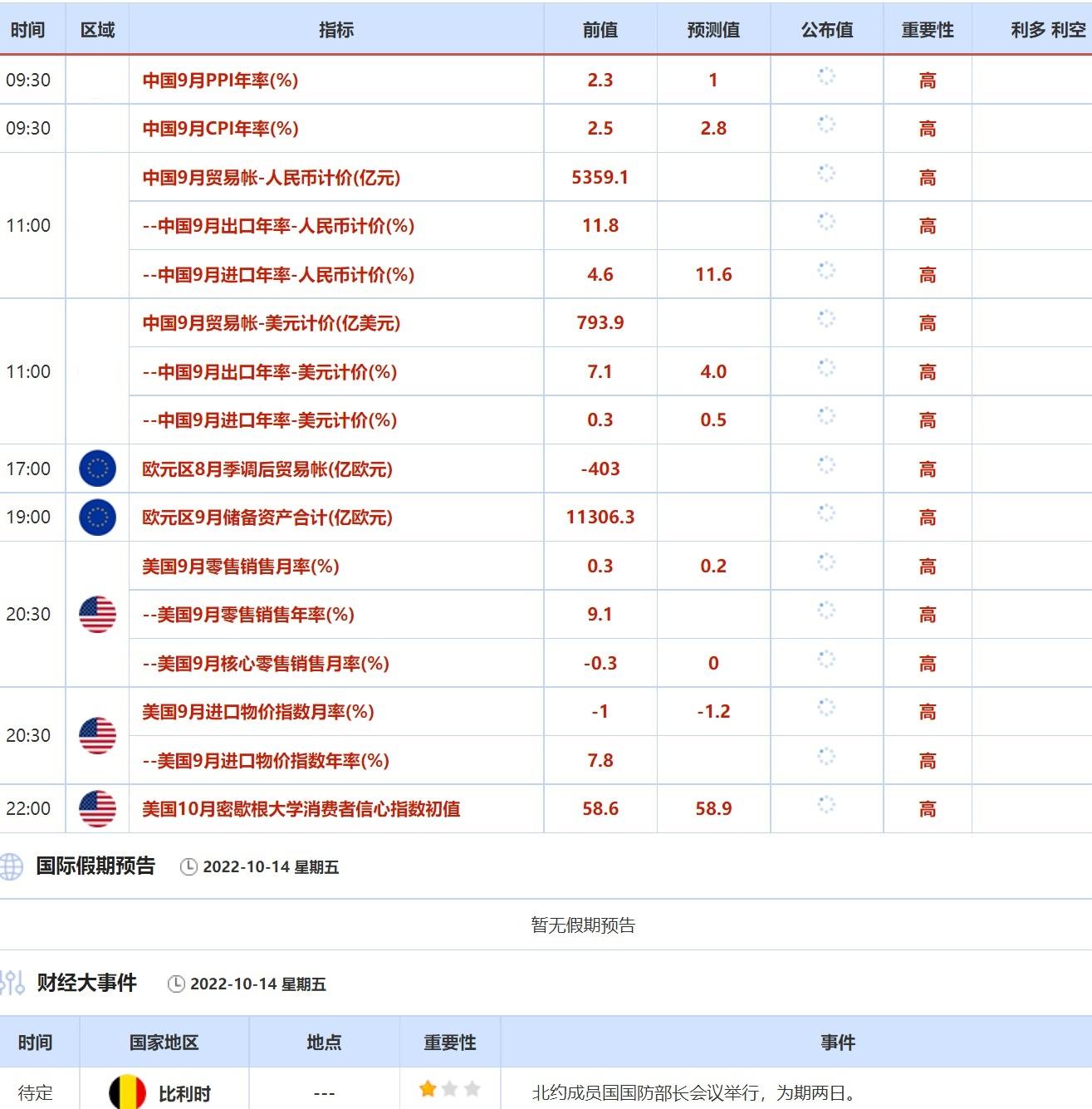 10月12日,美国将公布9月PPI年率,市场预期为8.4%,不及8.7%的前值。