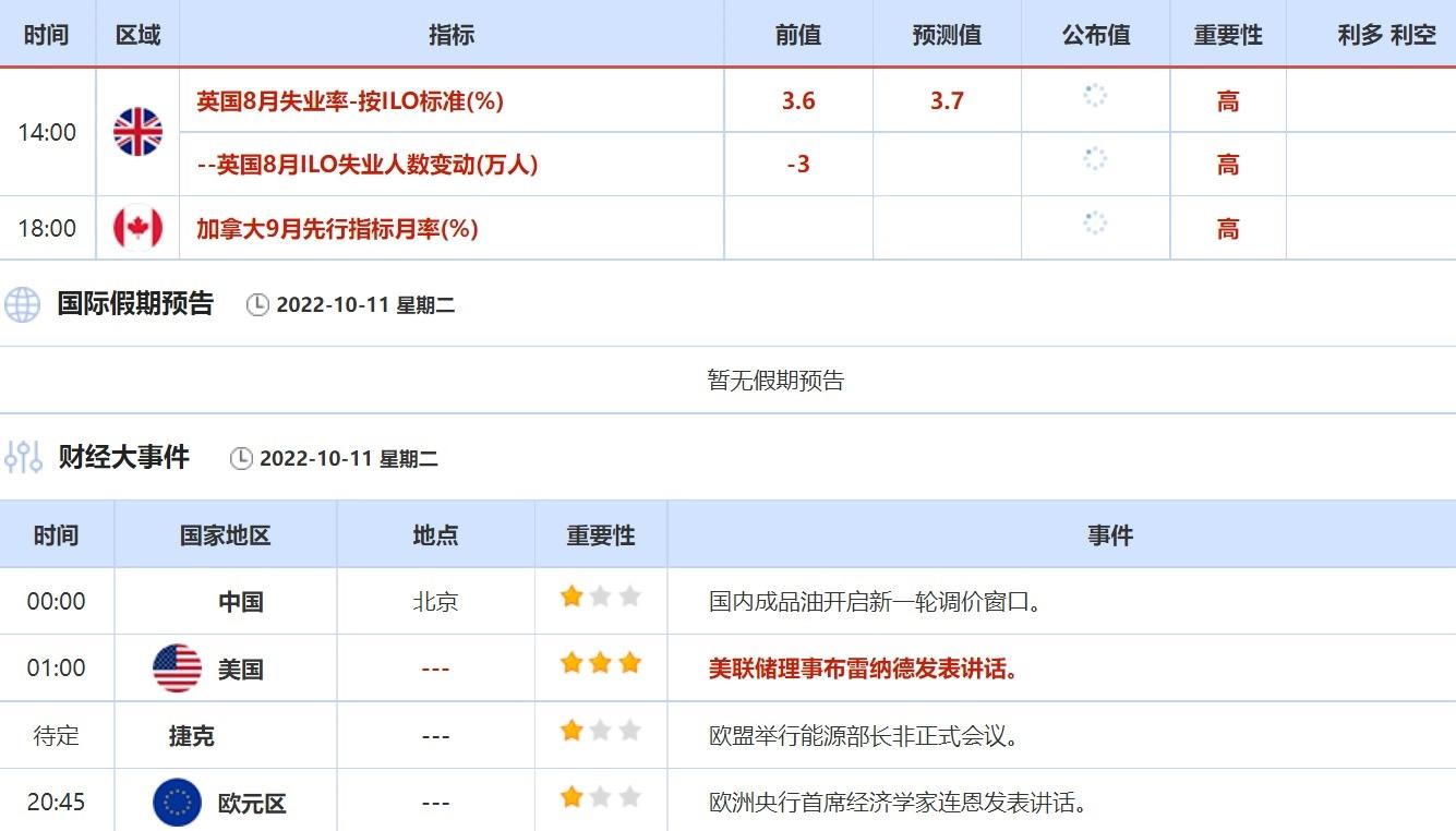 ②周二(10月11日)关键词:英国8月失业率-按ILO标准,欧盟能源部长会议