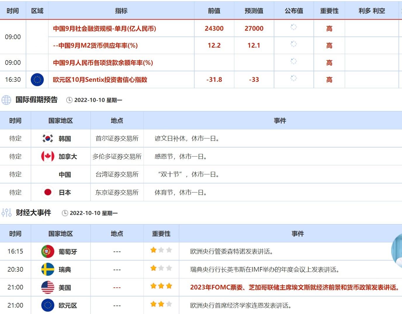 10月10日-10月15日当周,投资者需要关注的数据:欧元区10月Sentix投资者信心指数,英国8月失业率,英国8月工业产出月率,美国9月PPI年率,美国截至10月8日当周初请失业金人数,美国9月CPI年率未季调,美国9月零售销售月率。事件方面需关注芝加哥联储主席埃文斯,明尼阿波利斯联储主席卡什卡里,英国央行行长贝利以及欧洲央行行长拉加德的讲话。当周还需关注日本,韩国,中国台湾和加拿大等地的休市公告。