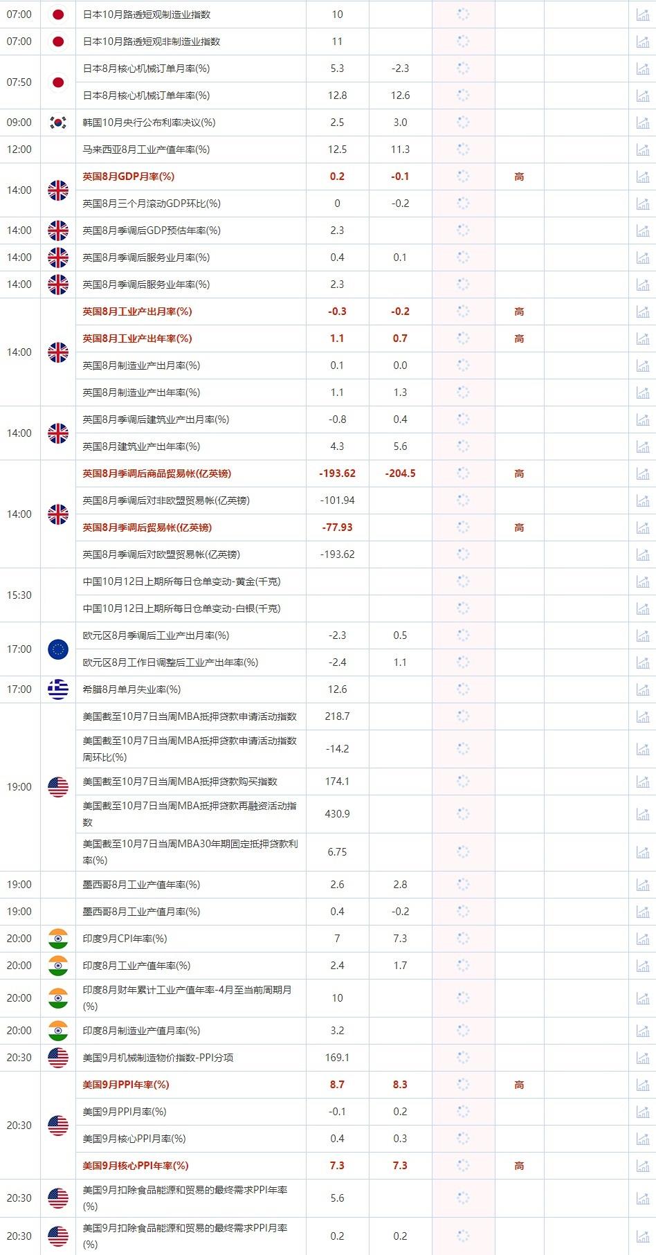 2022年10月12日,全球主要经济体将公布经济数据,需重点关注英国8月GDP月率,英国8月工业产出月率,英国8月工业产出年率,英国8月季调后商品贸易帐,英国8月季调后贸易帐,美国9月PPI年率, 大事方面需关注:韩国央行公布利率决议,OPEC公布月度原油市场报告,欧洲央行行长拉加德发表讲话,明尼阿波利斯联储主席卡什卡利发表讲话,G20财长和央行行长会议举行,至10月13日。