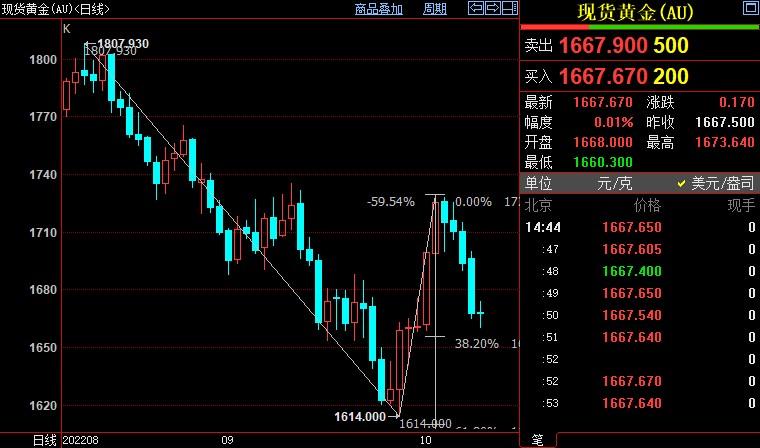 周二(10月11日),现货黄金在跌创六个交易日新低至1660.76美元/盎司后止跌反弹,投资者在美国通胀数据公布前持谨慎态度。但美联储激进加息前景料继续施压金价。
