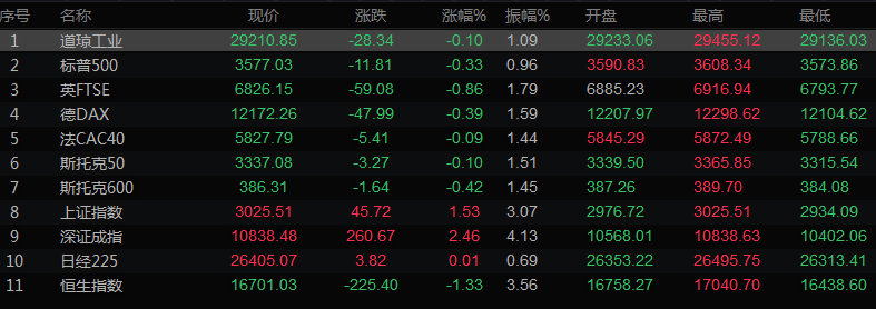 美股收盘情况:道琼斯工业平均指数下跌0.1%,至29210.85点;标普500指数下跌0.33%,至3577.03点;纳斯达克指数下跌0.09%,至10417.10。