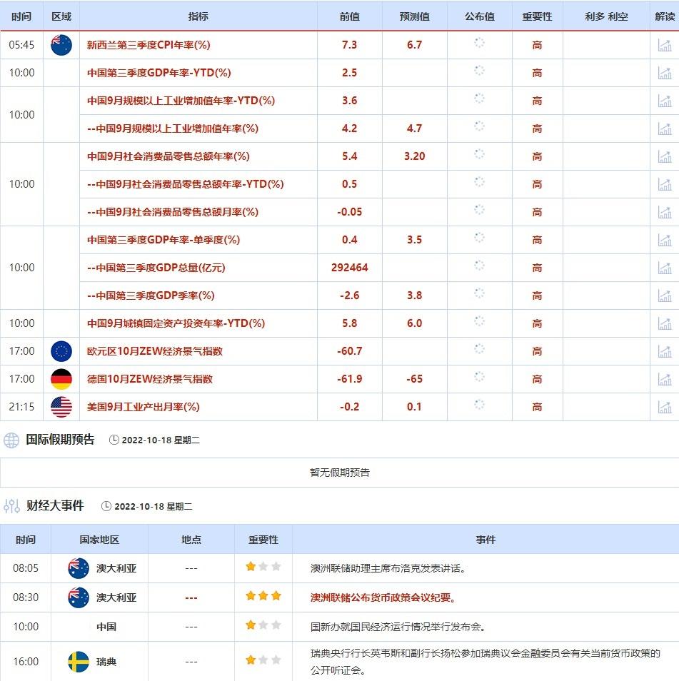 10月17日,投资者首先要关注欧洲央行副行长金多斯的讲话,了解他对欧元区经济和欧银政策的最新看法。金多斯在9月中旬表示,欧元区经济放缓或可能出现衰退将不足以控制住通胀,欧洲央行将不得不继续加息。