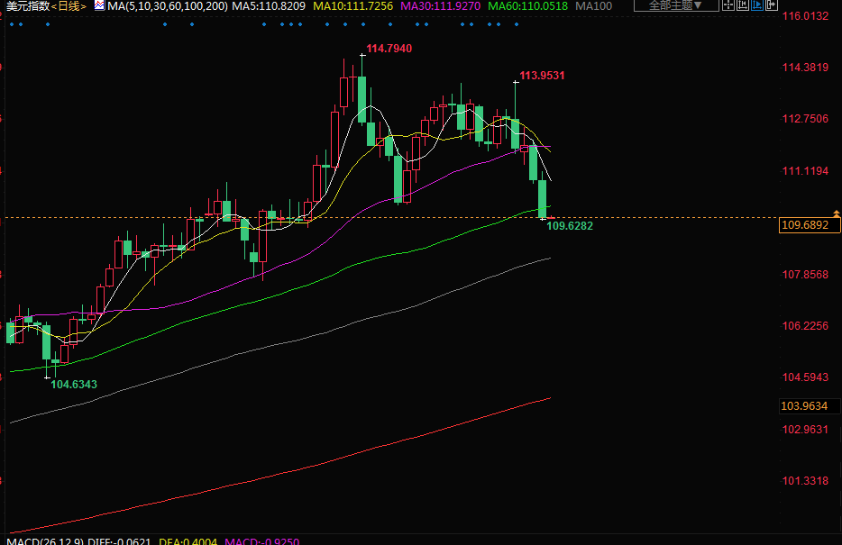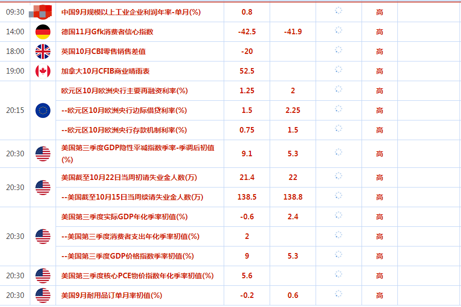 北京时间周四(10月27日)亚市早盘,美元指数交投于109.68附近;美元兑一篮子货币周三下跌超1%,为9月20日以来最低,经济数据疲软坚定了美联储将放缓加息步伐的看法,推动欧元兑美元一个月来首次回到平价之上;金价周三升至两周高位,因市场预期美联储将从12月开始收敛其激进的加息立场,拖累美元和美债收益率下滑;油价急升近4%,受助于美国原油出口创纪录高位,以及美国炼厂炼油量高于往年同一时期的水平。