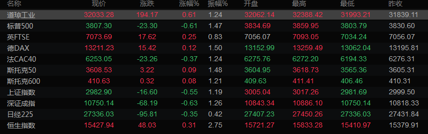 美股收盘情况:道琼斯工业指数上涨0.61%,至32033.28点;标普500指数下跌0.61%,至3807.3点;纳斯达克指数下跌1.63%,至10792.68点。
