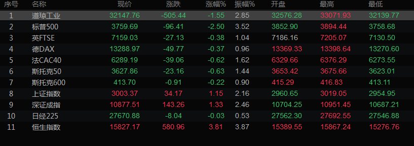 美股收盘情况:道琼斯工业指数下跌1.55%,至32147.76点;标普500指数下跌2.50%,至3759.69点;纳斯达克指数下跌3.36%,至10524.80。