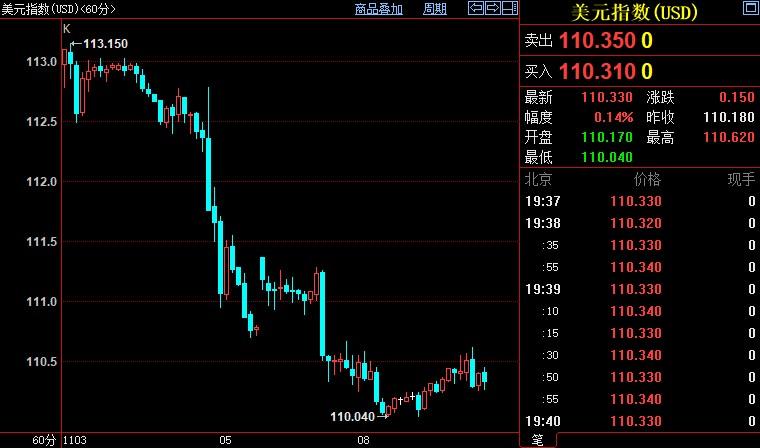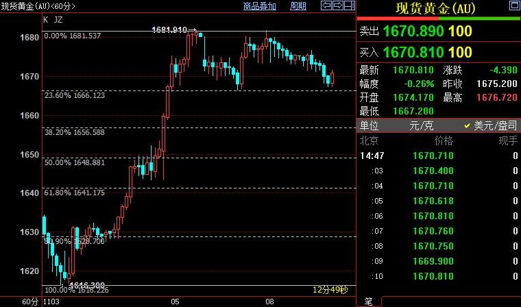 北京时间19:39,现货黄金下跌0.18%至1672.44美元/盎司;COMEX期金主力合约下跌0.32%至1675.1美元/盎司;美元指数上浮0.14%至110.334。