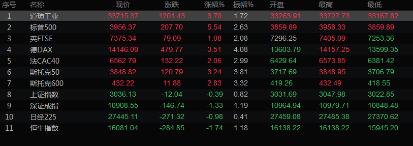 美股收盘情况:标普500指数大涨5.54%,收于3956.31点;纳斯达克指数暴涨7.35%,至11114.15点;道琼斯工业指数上涨3.70%,至33715.37点。