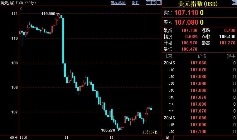 北京时间20:45,现货黄金下跌0.68%至1758.48美元/盎司;COMEX期金主力合约下跌0.44%至1761.6美元/盎司;美元指数上涨0.62%至107.073;10年期美债收益率上浮5.8个基点至3.887%。