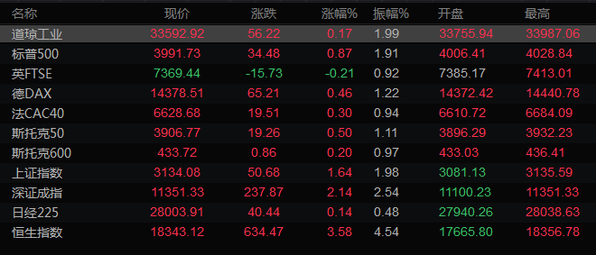 美股收盘情况:道琼斯工业指数上涨0.17%,至33592.92点;标普500指数上涨0.87%,至3991.73点;纳斯达克指数上涨1.45%,至11358.41点。